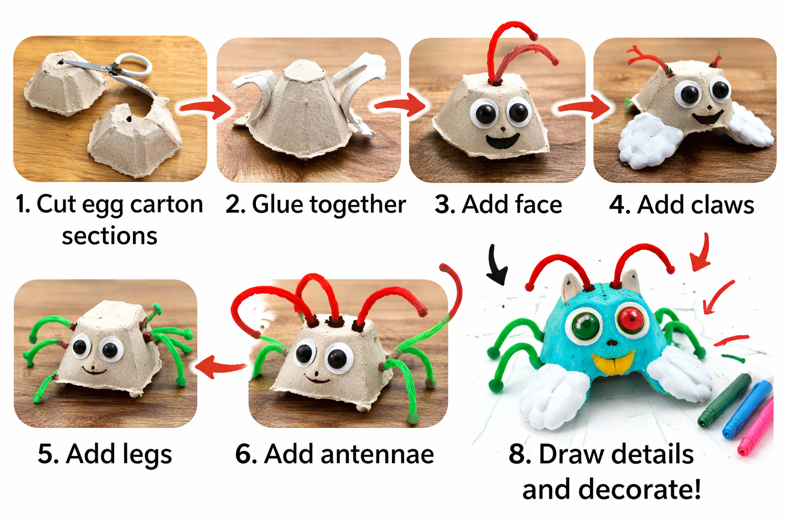 - Glue the egg carton sections together to form the shape of your litter bug. You can make a long bug, a round bug, or any silly shape you like. Use removable glue dots first if the kids want to experiment before choosing their final design.