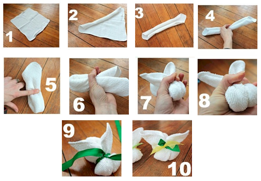 - Grasp the washcloth near the center and fold the loose ends back to begin forming the bunny shape.